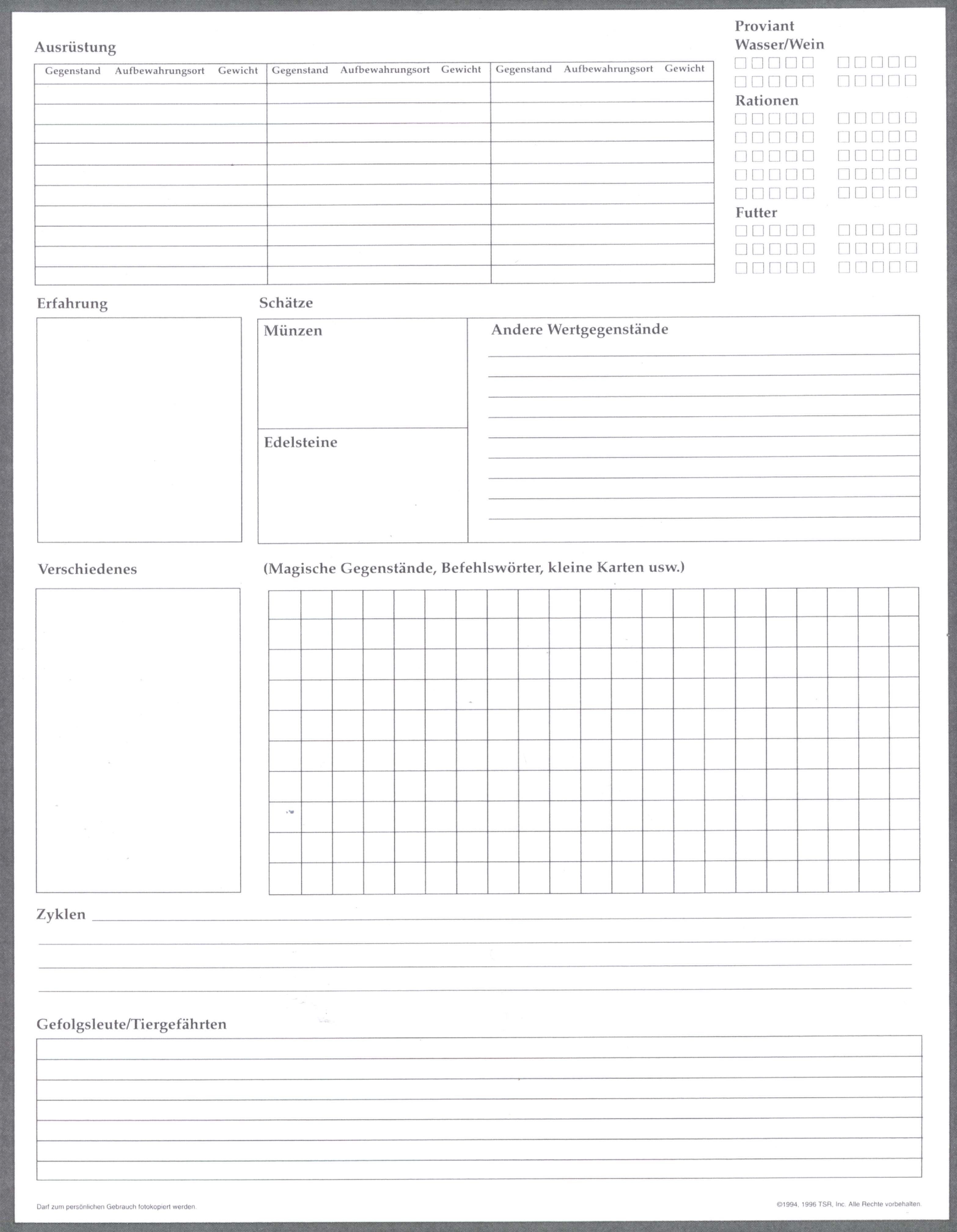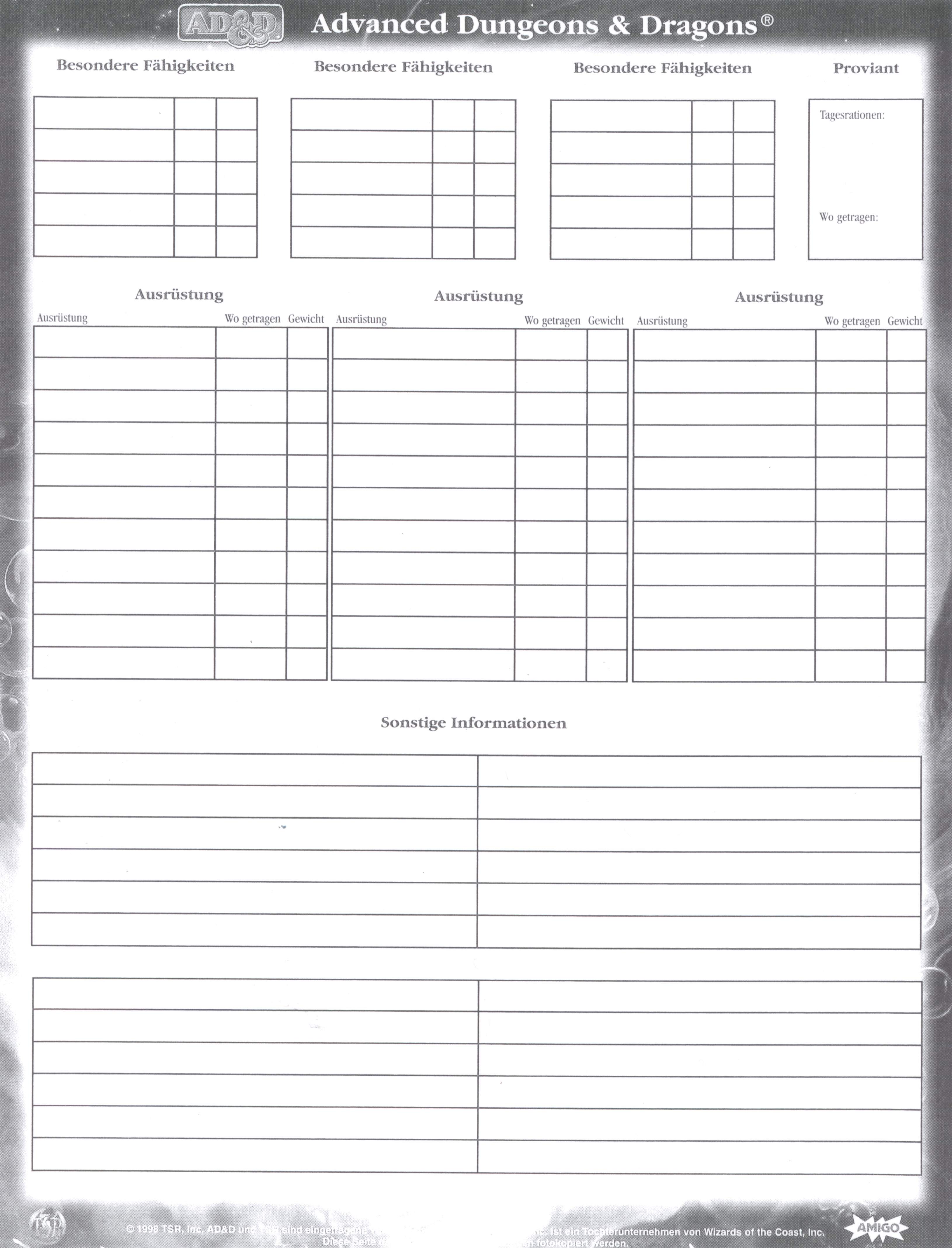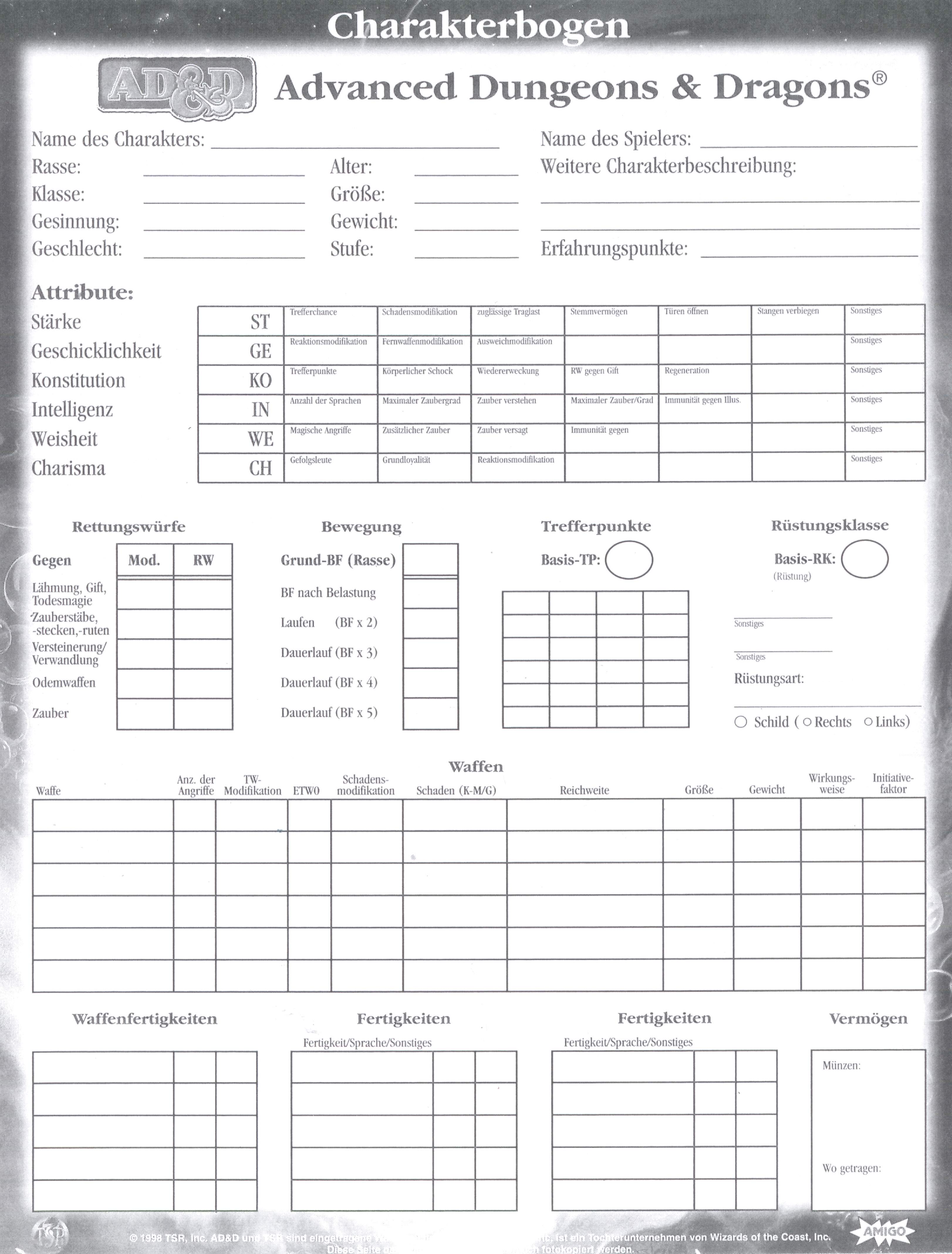 Hier findet ihr wissenswertes und interessantes zu AD&D und zum Rollenspiel allgemein! Wissenswertes & nützliche Dinge für einen Abenteurer (Word-Dokumente, Excel-Sheets, PDFs, ZIPs): Um den "Adobe Acrobat Reader" (für PDF-Dokumente) herunterzuladen klickt bitte hier! Wissenswertes & interessantes zu Waffen, Rüstungen & Ausrüstungsgegenständen Um den Adobe Acrobat Reader (für PDF-Dokumente) herunterzuladen klickt bitte hier! Um den "7-Zip" (für ZIP-Archive) herunterzuladen klickt bitte hier! Bilder & Grafiken für AD&D Charakterbögen und / inkl. Zauberbücher (Word-Dokumente, Excel-Sheets, PDFs): Um den Adobe Acrobat Reader (für PDF-Dokumente) herunterzuladen klickt bitte hier! Bei den nachfolgenden Dokumenten handelt es sich um "Amigo"-Originalbögen, die mit einem © versehen sind. Das herunterladen ist somit nur Mitgliedern unserer Rollenspielgruppe gestattet, welche diese Bögen auch gekauft haben! Mitglieder unserer Rollenpielgruppe geben bitte ihren Namen und ihr persönliches Kennwort für den Download ein! Original AD&D Charakterbögen (400dpi Scans / JPG): |